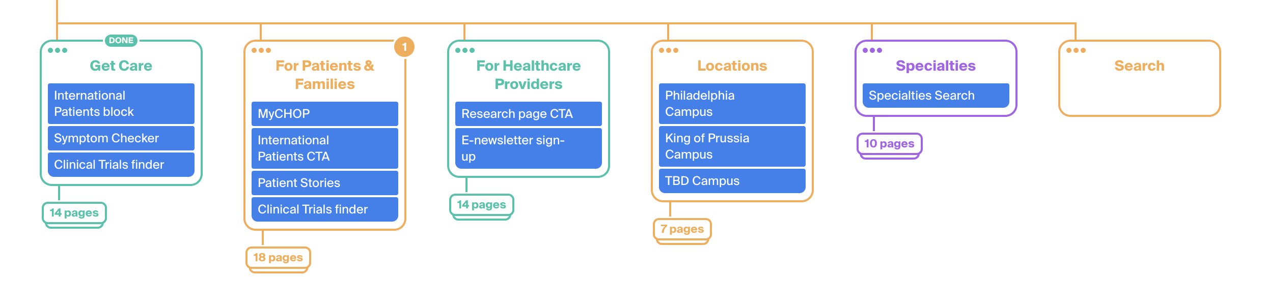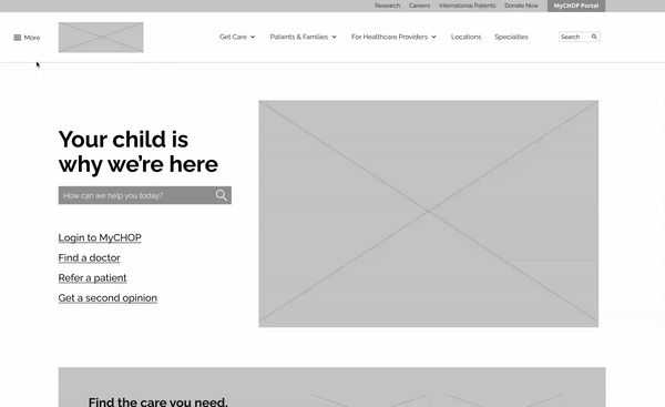 Create designated navigations for clinical and non-clinical information. CHOP stakeholders placed an emphasis on highlighting corporate initiatives and needed the ability to bring prominence to this information without adding complexity to finding care.